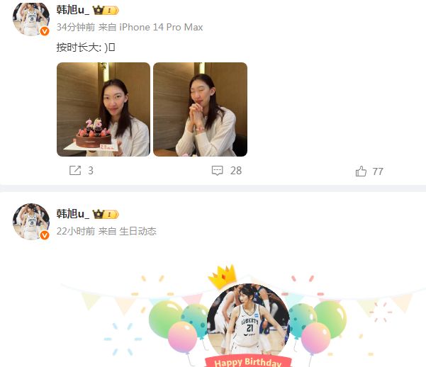 中国女篮内线核心韩旭更新社媒,晒出自己手捧蛋糕的照片,为自己的26岁生日庆生,并且配文写道“按时长大。”